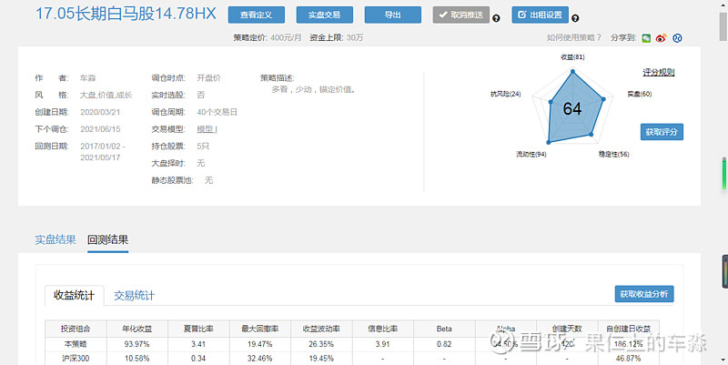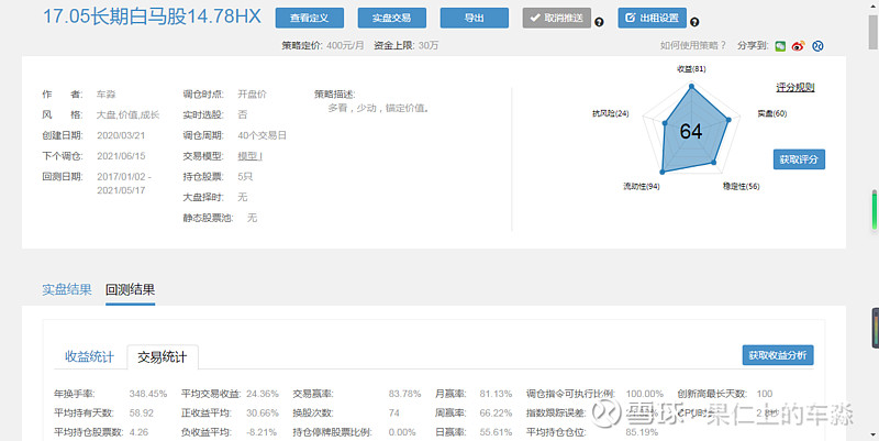 车淼个人目前在果仁量化网策略商城上上架了一个 长期白马策略,链接如下: