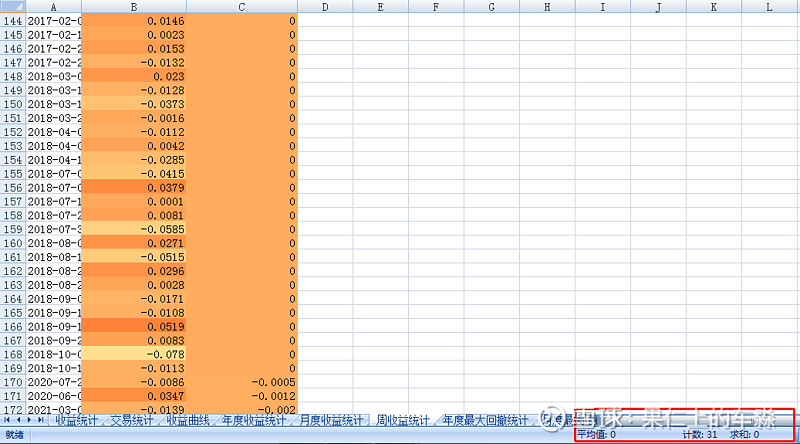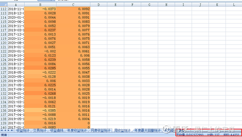 通过果仁网将交易数据导出,检查数据发现,以 周 为时间计,从17年到2021.5.18日,策略合计获得了137次正收益,平均每次获得3.72%正收益。