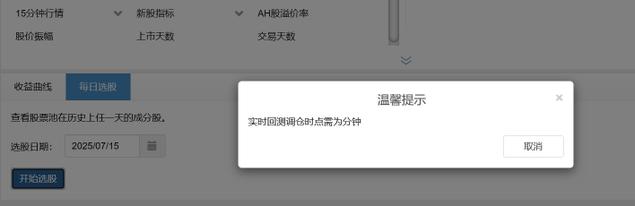 昨晚和今晚10点我股票池点击每日选股,都给我莫名其妙的提示,如今晚给的提示是“实时回测调仓时点需为分钟”,但股票池并没有实时回测的可选项吧,也没见有如策略那样调仓时点的可选项,怎么会出这种提示?点击了若干次,总还是这种提示……