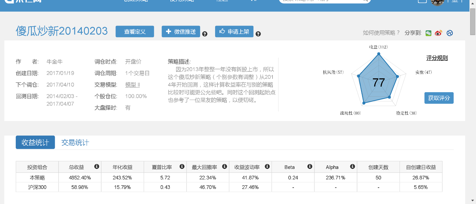 我的“傻瓜炒新20140203”策略https://guorn.com/stock/strategy?sid=18036.R.67053983515818,昨晚更新后的结果和刚才我打开策略定义没做任何修改回测后的结果大不相同,年化收益率和最大回撤率都不同,不知何故?