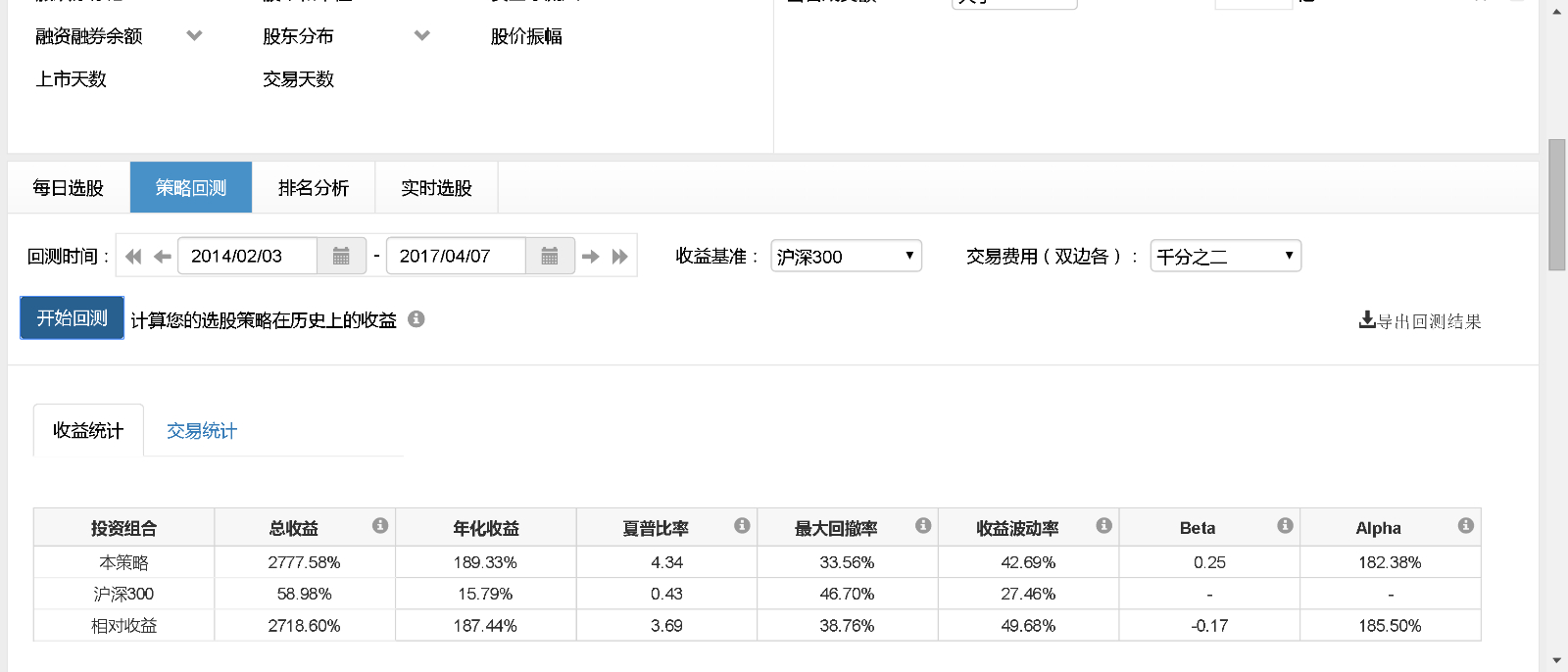 下面是打开策略定义后没做任何修改点击“开始回测”后的结果