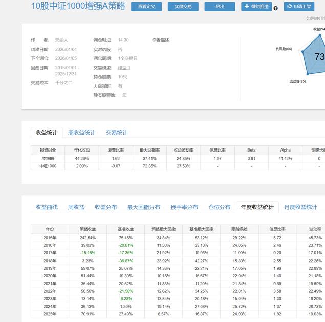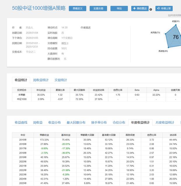由于中证1000只能从14年底才能开始回测,试了下10股和50股策略容量和收益率都相当可观,