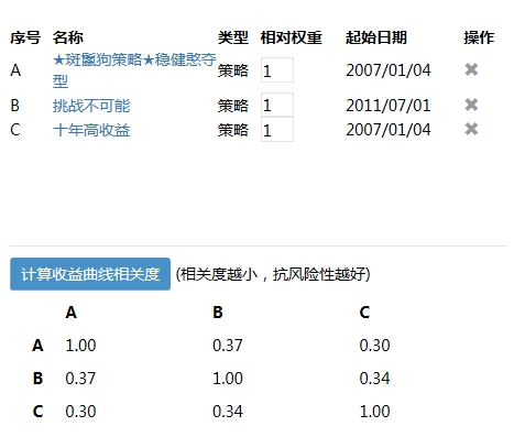 下面具体展示一个再平衡策略组合的案例。这个案例选择了商城策略中历史回测超过5年、年化收益最高的3个策略作为成分股(策略)。相关性分析表明,3个策略的相关度为0.3~0.37。