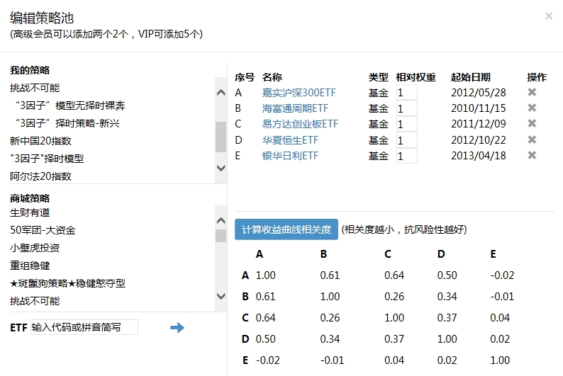 下图是策略池编辑的主界面,目前可以加入编辑的策略池主要有三块:我的策略、商城策略、ETF。高级会员只能添加2个,VIP可以添加5个。在添加策略以后,可以计算策略之间的收益相关度。