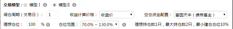 第三步、交易模型设置,由于需要用到自定义卖出条件因此选用模型II;同一时间下只持有一只ETF,所以理想仓位设置为100%;我们希望每天判断是否满足了买入/卖出条件,所以调仓周期设置为1天。当卖出仓内的ETF时,默认买入161010,所以‘空仓资金配置’选择‘富国天丰’。最终设置如下: