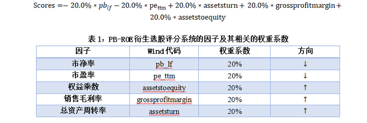 第二、构建基于PB-ROE衍生的选股评分系统;先对市净率、市盈率、权益乘数、销售毛利率和总资产周转率五大因子进行由小至大的排序,再通过线性的方式构建评分模型,即PB-ROE衍生选股评分系统。其具体公式如下: