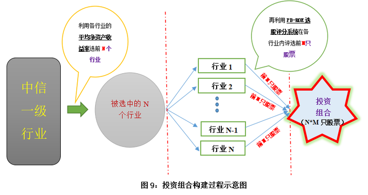 第三步、利用PB-ROE选股评分系统在前N个行业内分别进行股票打分及对其进行由大至小的排序。其中,格雷厄姆价值投资评分系统的评分越高,则表明该股票在短期内具有越高的投资价值。由此,通过选取各行业内的前M只股票作为投资标的,并组成一个新的投资组合(N*M只股票)。具体选股过程如图9所示。