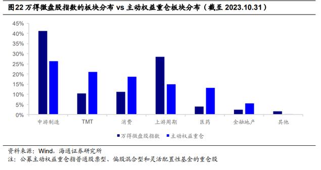 第二,万得微盘股指数重仓板块的交易拥挤度合理,或可免于下跌市中因抱团快速瓦解引发的回撤。以最新一期持仓为例,万得微盘股指数在公募主动权益重仓的消费、医药和TMT板块上配臵更低,但在公募低配的上游周期板块上配臵更高。