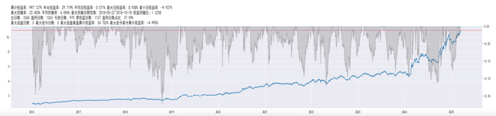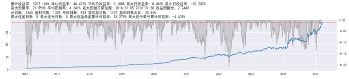 第一部分,就是风格选择_原始模型的表现,也就是根据构建的沪深300与微盘500指数的风格轮动判断,买卖指数的累计收益表现;从表1可见,16年开始直至25年3月27日,所有年度都是赚钱的,年度胜率为100%,总体来说比较平稳。从图9可以看到,年化收益率为29%左右,最大回撤在22%左右,明显比24年1-2月分急速杀跌时的最大回撤小,这也侧面证明了市值风格轮动方案的有效性或风控能力。
