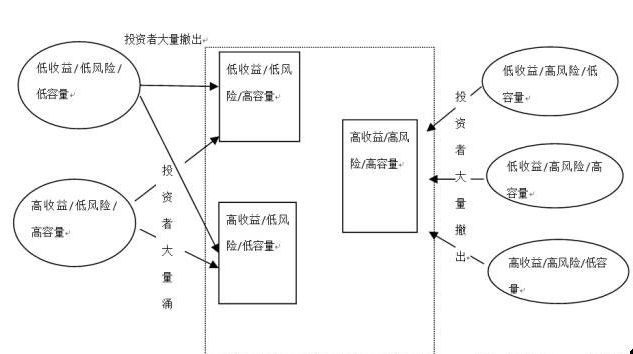在低收益/低风险情况下,投资者肯定优先选择高容量的策略,来使得自己的绝对收益最大化,所以该策略会遭到淘汰。由于采用该策略的投资者变少,从而使得该策略的收益变大,从而转化为高收益率/低风险/低容量策略。