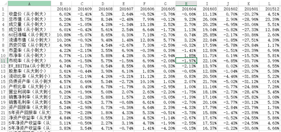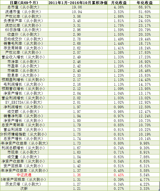 原始的表格并不适合数据处理,我们进行转置后,再统计2011年1月到2016年10月一共69个月的各因子累积净值。