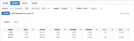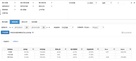 示例1:我们选择一个衰落样本总数比较多的60日涨幅,也假设测试日期时我们获得的样本数据足够多。在13年9月和10月,表现都是第9档,衰落期。根据统计我们发现可以,在10月底,简单建一个60日涨幅因子5日调仓持有10股的策略,收益如下。