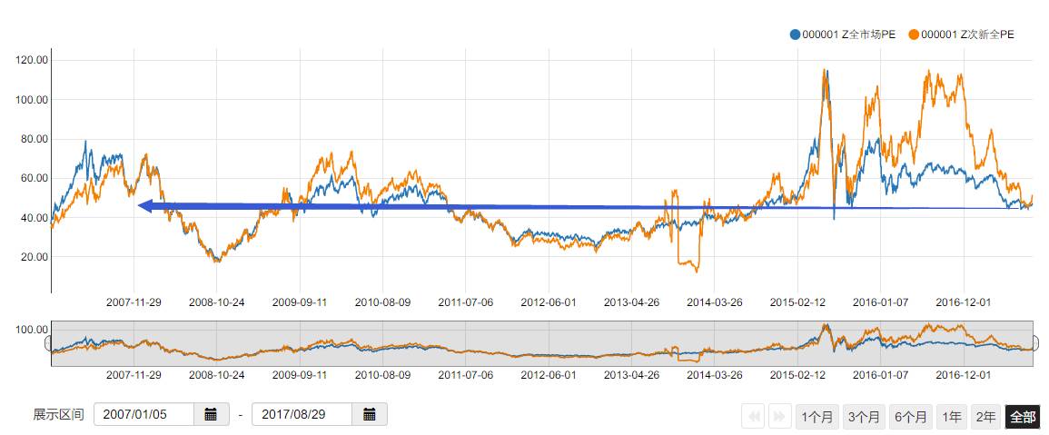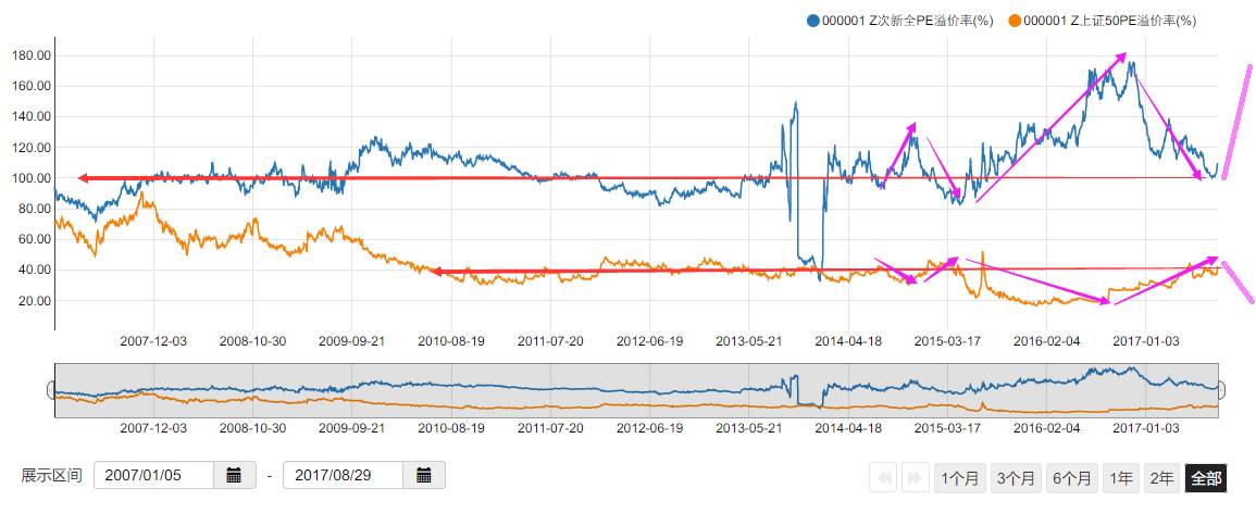 如果上图还不够说服力,那么下图就更能简洁明了的说明情况。我将次新PE和上证50PE除以全市场PE,得到次新和上证50溢价率,可以看到次新溢价率100%是就是历史底部,80%就是历史大底,半个月前正好跌到100%。