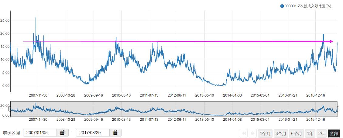 细心的童鞋可能发现了一个指标已经高估,就是次新成交额占全市场比重,历史上次成交额占比到达15%就是顶了,也就是天量天价。但是别忘了次新数量也是越来越多了,成交额占比上升也是理所当然,只不过这波成交额是一下就变大,并不像以前一样是反复逐渐变大,也就是说,只有少数人在这波次新行情赚钱了。而昨天下午次新出现了跳水,正是这少数一拨人兑现利润了,这个通常不会只是一天,也就是说最近几天就是上车机会了。