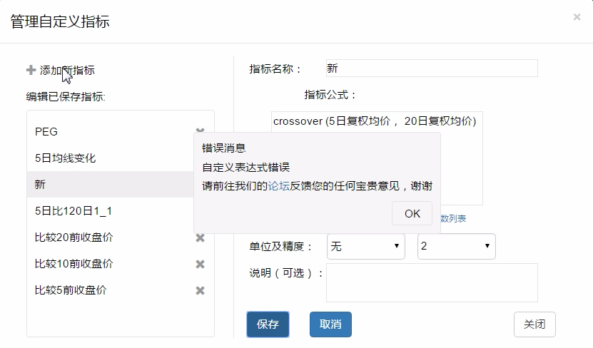 我把这个原文本复制粘贴到编辑框中crossover (5日复权均价, 60日复权均价) 另存为了一个指标“新”,成功了。随手我想改改日期,却发现系统并不承认,我把5日复权均价, 60日复权均价改成别的日期,系统说我的表达式错误了,这是咋回事呢?只能接受5日线-60日线这一种组合吗?那这还算是自定义指标吗?