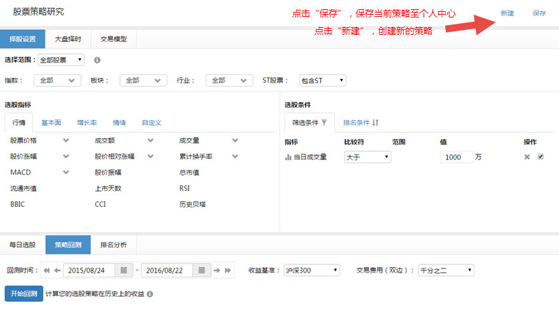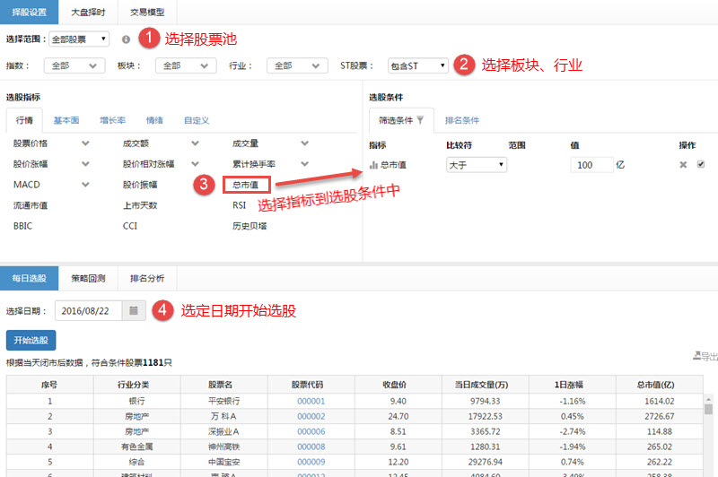 用户首先选择几类指标制定选股策略, 然后查看每日选股结果, 如果符合预期,可在历史的日期区间进行回测。下图展示使用流程,非常简单。