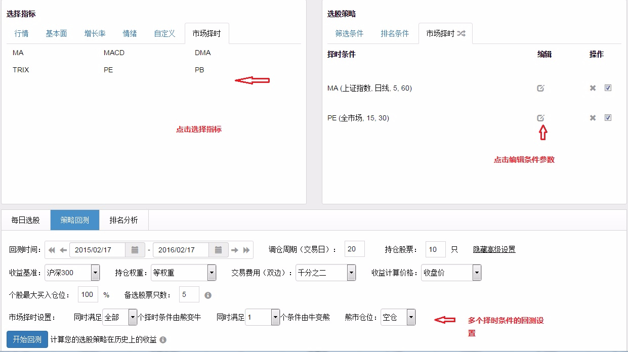 当有市场择时条件时, 用户可以限制熊市整体股票仓位,比如在50%。 这时,在每个熊市调仓日,回测程序都会把整体股票仓位设置为50%。