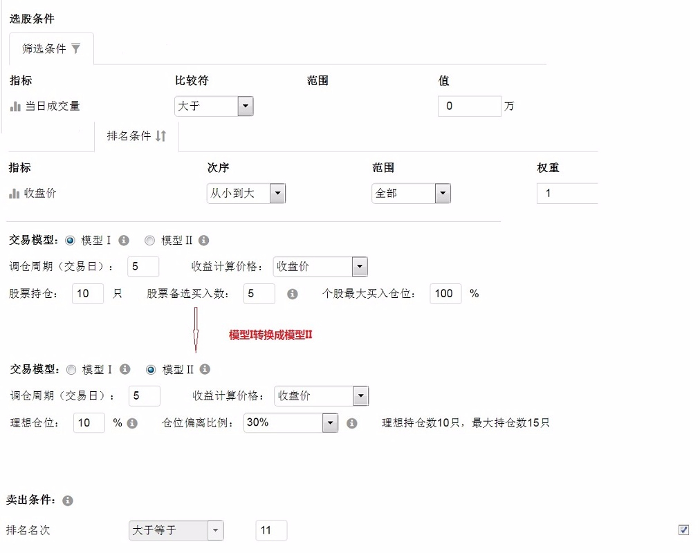 模型II也有备选股票的概念, 备选只数固定5只。 比如调仓日需要买入1只股票,模型II会推荐 1+5 = 6只买入(或加仓)的股票。 意思是如果排在前面的股票能买入, 就买入, 如果不能买入, 就试图买入排在后一名的股票,直到可以买入股票为止或者扫描完买入清单为止。 当策略有较严格的买入条件时, 比如在新股买入限制里设定排名名次小于等于3, 备选股票可能小于5只股票。