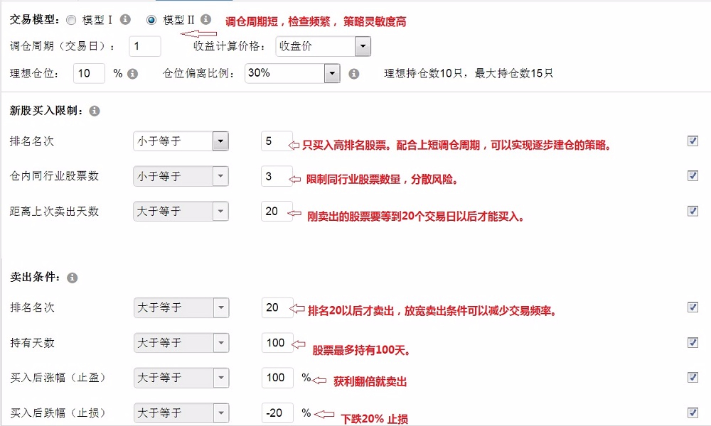 模型I是一个定期调仓并且重新平衡仓位的交易模型。模型I对持仓股票的最大数量做出了规定, 比如最多持有5只股票, 意思就是在每个调仓日策略都试图买入或持有5只股票, 每只股票的仓位是20%, 当可以买入的股票数小于5只时,比如只有3只,策略会按照33%的个股仓位买入3只股票。 (用户可以改变个股最大买入仓位100%的设置,设为比如20%, 在这种情况下,即便只能买入3只股票,策略依然会按照20%的个股仓位买入3只股票,空出40%的仓位为现金。)