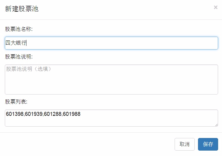 2创建一个4大银行的静态股票池, 我们可以将四大银行(即工商银行 601398,建设银行 601939,农业银行 601288,中国银行601988)的股票代码直接输入到股票列表里,然后点击保存。如下图:
