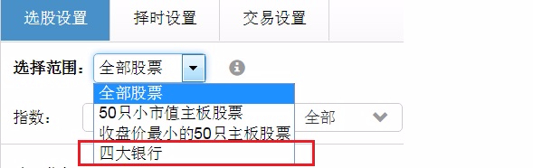 3 创建股票池完毕后,去创建股票策略->选股设置页面,“四大银行”股票池出现在选择范围的下拉菜单里,如下图。