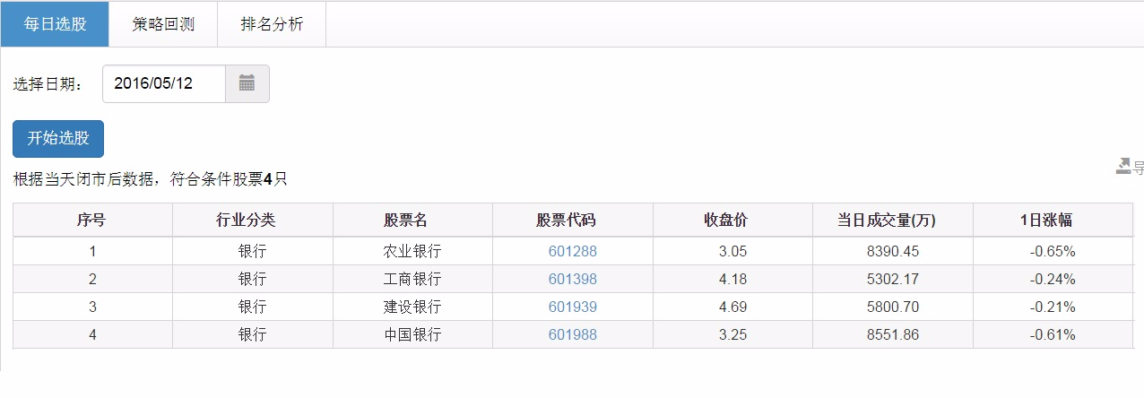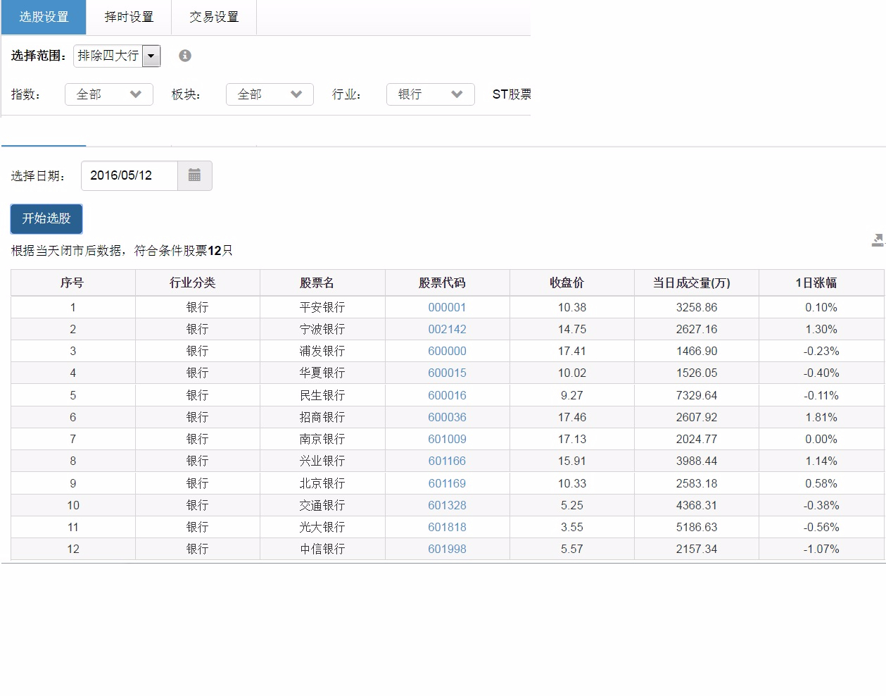 2 在创建股票策略->选股设置页面,选择范围设定为“排除四大行“,行业为 “银行”, 通过每日选股, 可以看到银行股票列表里已经排除四大行。 如下图。