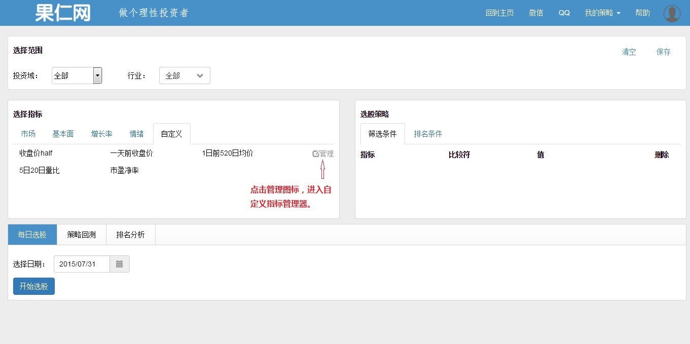 在果仁网上,股民可以使用鼠标点击在几秒之内创建选股策略,并在真实的历史数据中评估策略的有效性。有了这个能力,业余人士和专业人士的差距就大大缩小了。